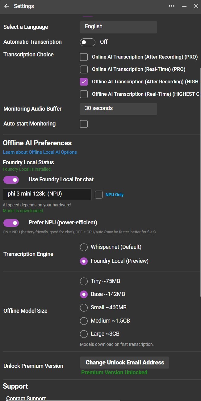 Running AI models locally can be resource-intensive. Depending on your device's CPU, NPU, or GPU capabilities and the model size you choose, transcription and chat responses might take longer than cloud-based AI services. If you have a GPU then you can try any of the models in the settings. If your machine has an NPU then perhaps choose one of those - but note in our experience the NPU is not necessarily faster than the GPU - but it is more power efficient for tasks like normal chat. If you are processing a PDF file for instance try to use the GPU setting. Doing Local AI really does need a machine with lots of RAM but with Quick Notes App you can be confident that you can run a small Offline AI model even when you are not connected - or on a plane! We’ve tried the phi-3-mini model and its very good. Results might take a few seconds but it’s all local! We’ve even included the ability to process PDF and .docx files locally but performance for large amounts of text really needs a GPU.